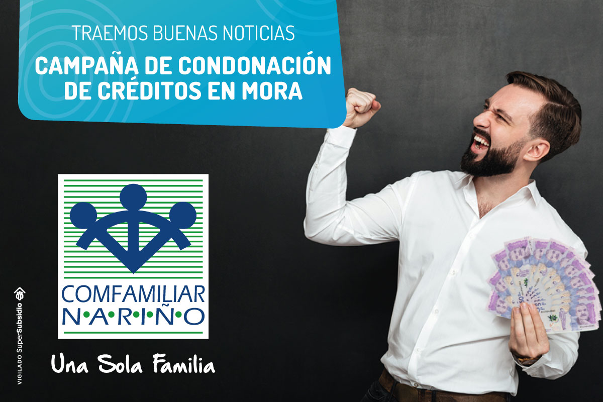 La Caja de Compensación Familiar de Nariño, pensando en el interés y bienestar de sus afiliados, y en las posibles dificultades que puede acarrear un reporte negativo en el ámbito financiero, ha iniciado una campaña de normalización de créditos que se llevará a cabo a partir de la fecha hasta el próximo 31 de diciembre del año en curso; por medio de la cual extendemos una invitación abierta a todos nuestros afiliados con el objetivo sanear sus deudas.