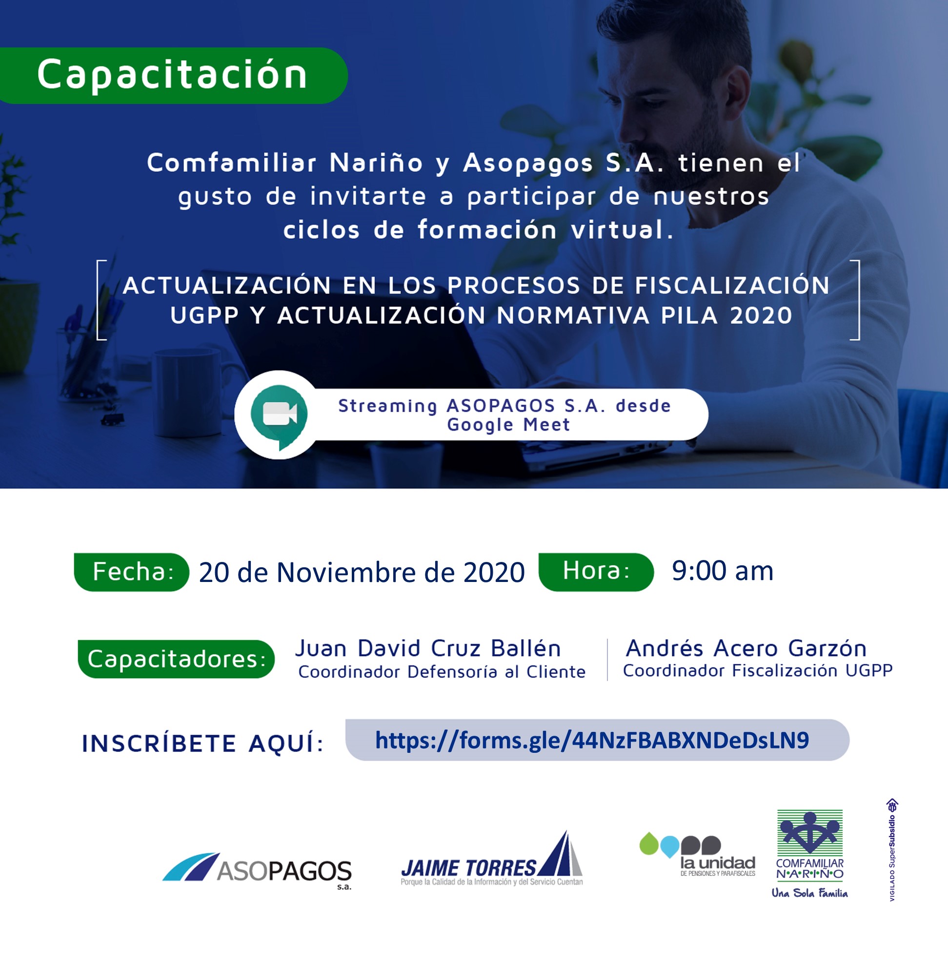 Comfamiliar de Nariño y Asopagos S.A, realizará la capacitación virtual en: Actualización en los procesos de fiscalización UGPP y actualización normativa Pila 2020.