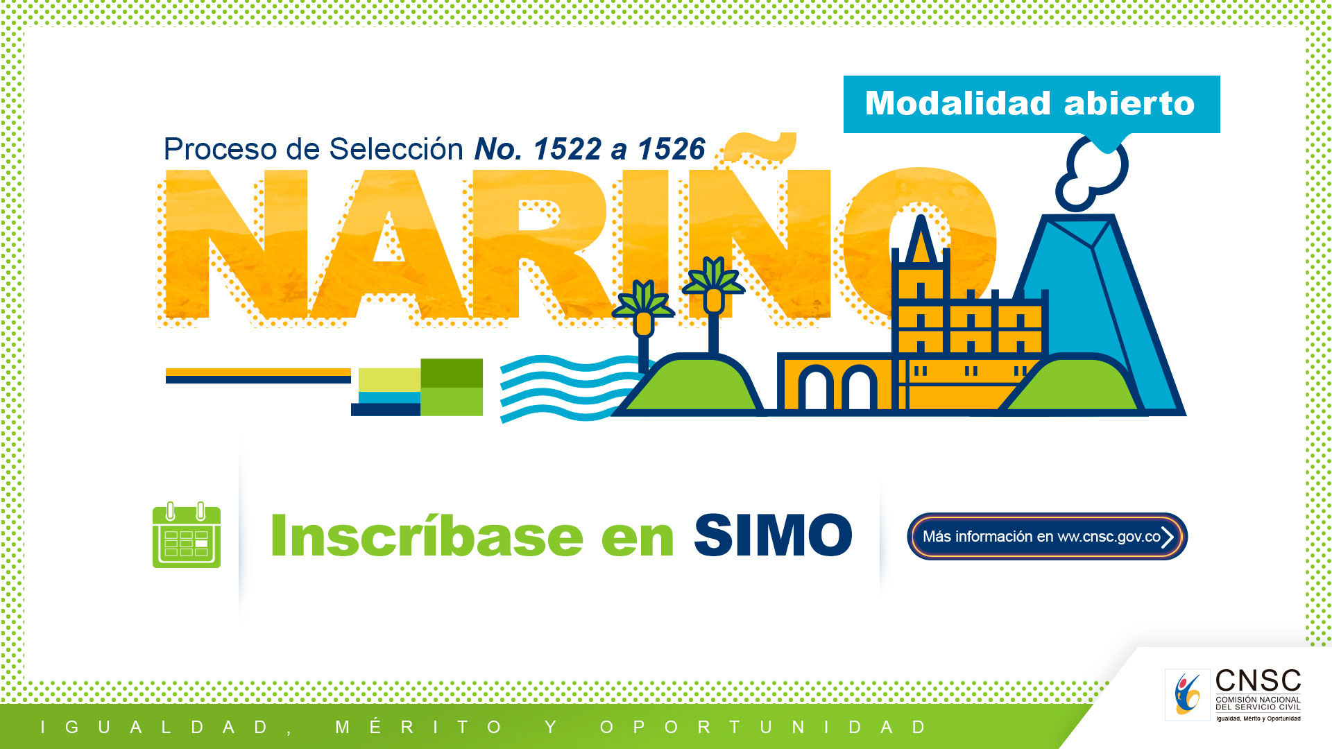 Comisión Nacional del Servicio Civil se encuentra adelantando una Convocatoria para proveer vacantes de Carrera administrativa con la Gobernación de Nariño, en la cual se están ofertando cargos para los niveles profesional, técnico y asistencial; para lo cual las personas interesadas tendrán plazo de inscribirse hasta el próximo domingo 12 de Septiembre en la plataforma SIMO (Sistema de Apoyo para la Igualdad, Mérito y la Oportunidad), donde se podrá obtener la información pertinente de cada empleo ofertado.