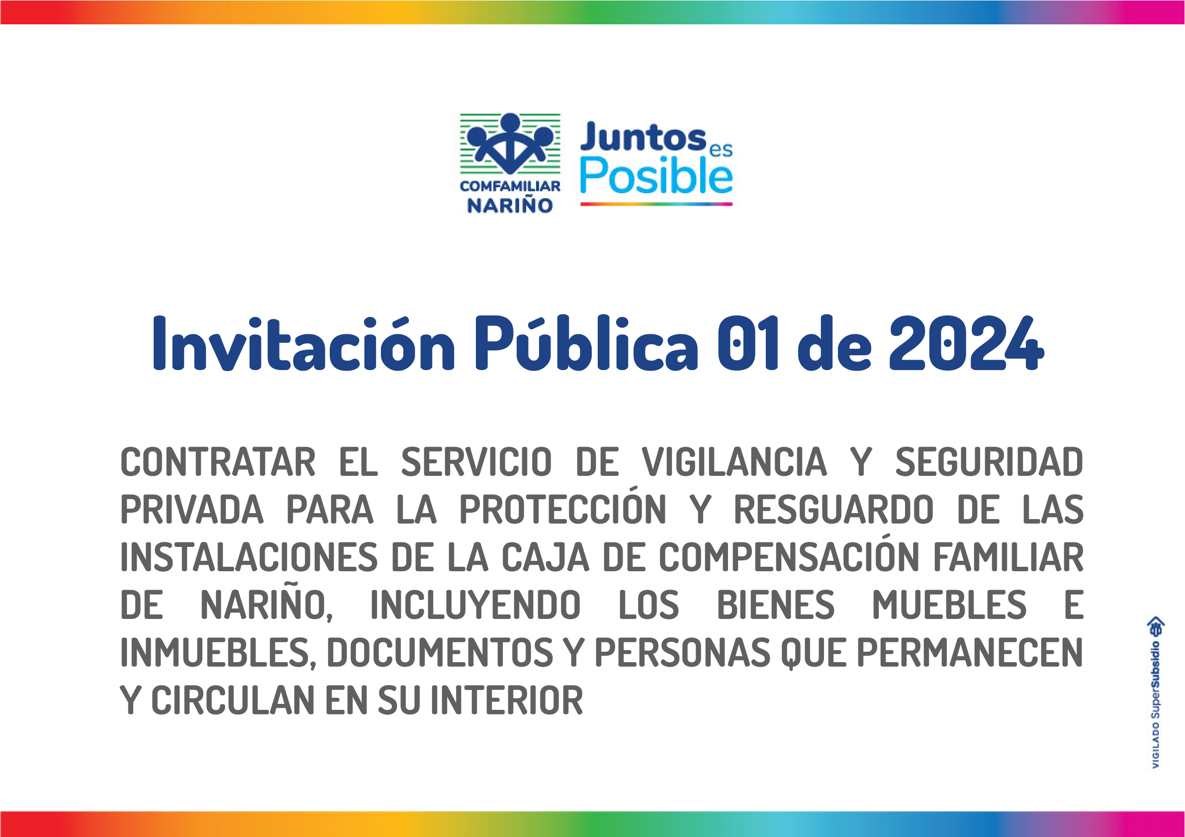 La CAJA DE COMPENSACIÓN FAMILIAR DE NARIÑO, está ¡nteresada en que participen empresas de vigilancia legalmente constitu¡das y domiciliadas en Colombia, para contratar la prestación del servicio de vig¡lanc¡a y seguridad pnvada, de los bienes muebles e inmuebles en las sedes de la Caja de Compensación Familiar de Nariñ0, según el alcance descr¡lo en los presentes Términos de Contratación.